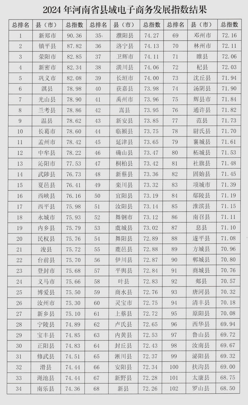 12月1日,《河南省县域电子商务发展指数报告(2024)》正式在郑州发布,根据指数结果显示,排名前十的县(市)依次是:新郑市、镇平县、荥阳市、新密市、巩义市、淇县、光山县、兰考县、温县、长葛市。 电子商务作为新时代农村经济转型升级的重要驱动力,不仅深刻重塑了农村传统的产销模式,更在推动农产品上行、促进农民增收、助力乡村产业振兴方面发挥着重要作用。作为人口大省和农业大省,河南省积极拥抱数字化、智能化等电子商务发展的新趋势,为河南省县域电子商务的创新升级探索新空间、新路径,同时,出台了一系列着力加强农村基础设施建设、激发县域商业发展活力、优化县域经济发展环境的政策措施,促进了电子商务与实体经济深度融合,为河南省县域电子商务的发展注入了强劲动力。