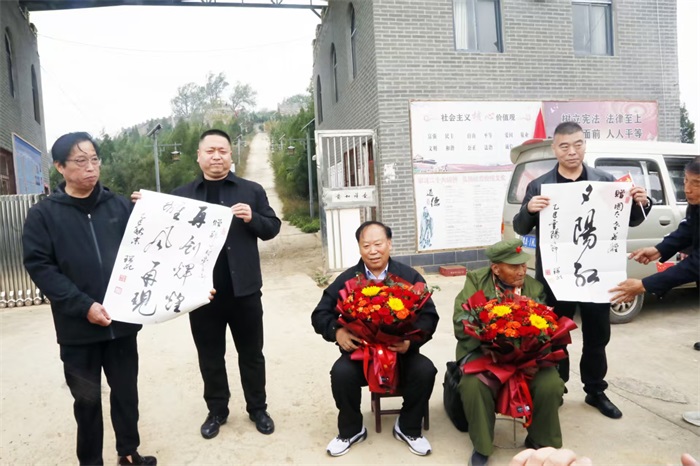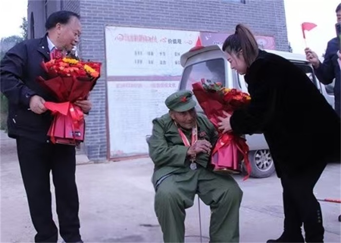 郑冲村党支部代表向102岁的抗美援朝老英雄金国太敬献鲜花,全体人员与老英雄合影留念,定格下这一凝聚敬意与温情的珍贵时刻。