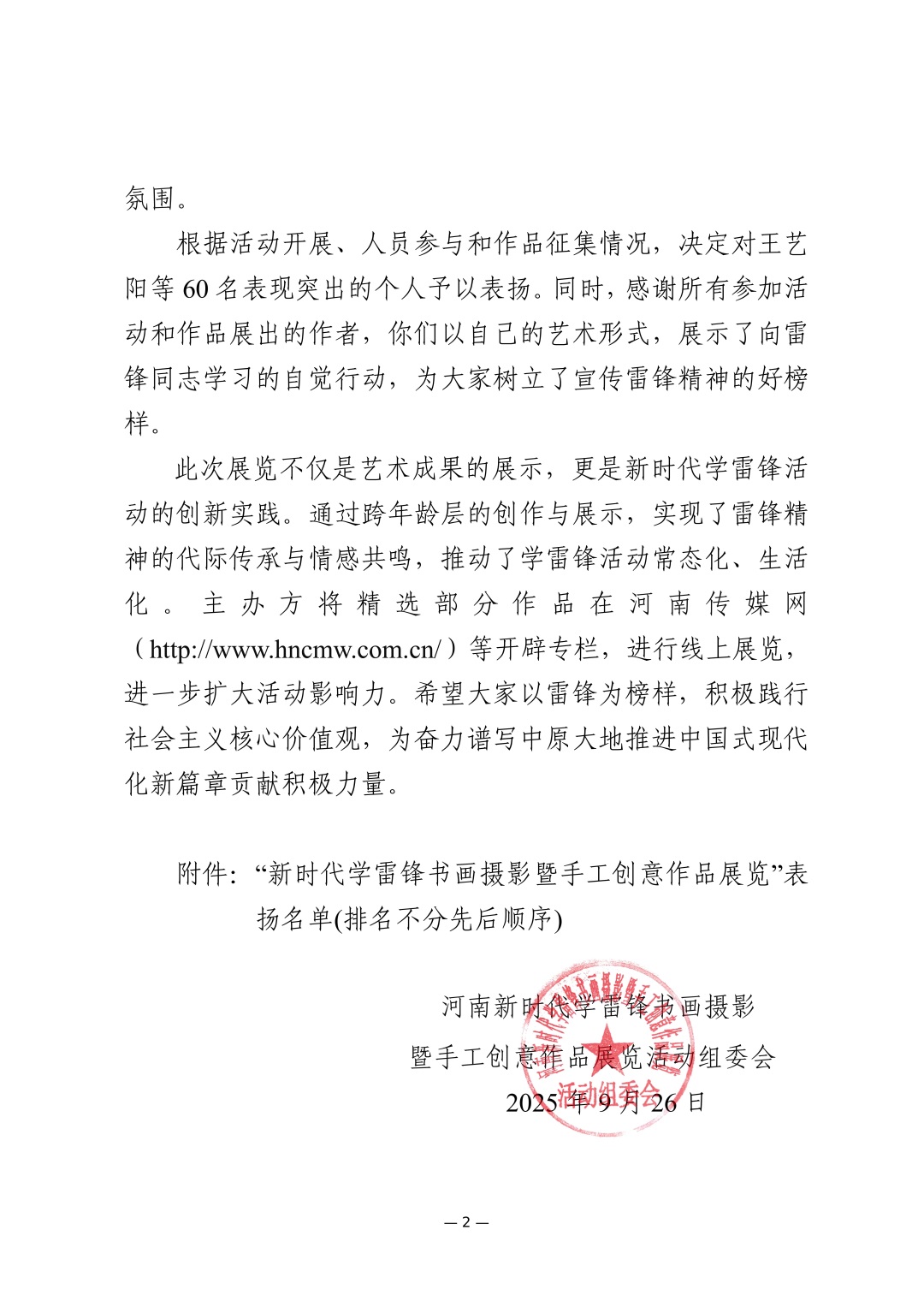 关于对“新时代学雷锋书画摄影暨手工创意作品展览”活动中表现突出个人予以表扬的通知 各相关单位、活动参与人员: 由河南省关心下一代工作委员会、河南省老新闻工作者协会、河南省慈善联合总会、河南省直文学艺术界联合会、河南广播电视台音乐广播主办,河南省慈善联合总会雷锋基金承办的“新时代学雷锋书画摄影暨手工创意作品展览”活动自开展以来,得到了全省各地的积极响应与广泛参与,取得了良好的社会反响。现将活动有关情况通知如下: “新时代学雷锋书画摄影暨手工创意作品展览”活动自2025年2月23日开始上线,至3月5日圆满结束,此次活动面向全省征集作品,共收到书画、摄影及手工创意作品 4000余件。经专家严格遴选,挑选出1503幅精品,分少年、青年、成人三大板块在线上展出。展览通过传统艺术与现代传播手段结合,生动诠释了雷锋精神在中原大地的传承与弘扬,网络访问量突破107万人次,点赞量高达40多万,“学习强国”、大河网、顶端新闻、大象新闻、今日头条和河南传媒网等媒体纷纷报道了活动情况,营造了全民学雷锋的良好氛围。 根据活动开展、人员参与和作品征集情况,决定对王艺阳等60名表现突出的个人予以表扬。同时,感谢所有参加活动和作品展出的作者,你们以自己的艺术形式,展示了向雷锋同志学习的自觉行动,为大家树立了宣传雷锋精神的好榜样。 此次展览不仅是艺术成果的展示,更是新时代学雷锋活动的创新实践。通过跨年龄层的创作与展示,实现了雷锋精神的代际传承与情感共鸣,推动了学雷锋活动常态化、生活化。主办方将精选部分作品在河南传媒网(http://www.hncmw.com.cn/)等开辟专栏,进行线上展览,进一步扩大活动影响力。希望大家以雷锋为榜样,积极践行社会主义核心价值观,为奋力谱写中原大地推进中国式现代化新篇章贡献积极力量。