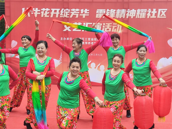 由伏牛北社区精心孵化的“飞龙手鼓队”闪亮登场,她们带来的《学习雷锋/欢聚一堂》将活动推向了高潮。激昂的鼓点声与现场热烈的欢呼声交织在一起,手鼓的力与美展现得淋漓尽致。这不仅是一场艺术表演,更体现了社区居民在党的号召下,积极弘扬雷锋精神,团结一心、欢乐和谐的精神风貌。随后,充满异域风情的新疆舞《古力亚尔》等精彩节目轮番上演,一次次将现场气氛推向新的高潮,雷鸣般的掌声此起彼伏,回荡在整个活动现场。