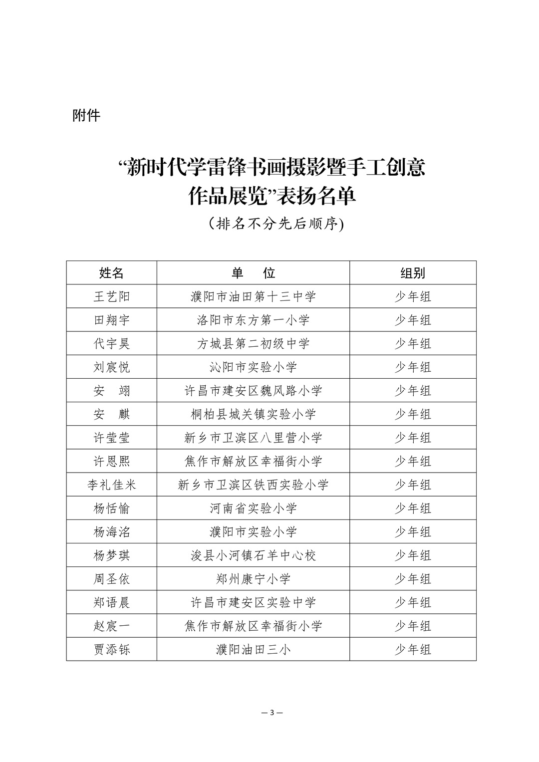 关于对“新时代学雷锋书画摄影暨手工创意作品展览”活动中表现突出个人予以表扬的通知 各相关单位、活动参与人员: 由河南省关心下一代工作委员会、河南省老新闻工作者协会、河南省慈善联合总会、河南省直文学艺术界联合会、河南广播电视台音乐广播主办,河南省慈善联合总会雷锋基金承办的“新时代学雷锋书画摄影暨手工创意作品展览”活动自开展以来,得到了全省各地的积极响应与广泛参与,取得了良好的社会反响。现将活动有关情况通知如下: “新时代学雷锋书画摄影暨手工创意作品展览”活动自2025年2月23日开始上线,至3月5日圆满结束,此次活动面向全省征集作品,共收到书画、摄影及手工创意作品 4000余件。经专家严格遴选,挑选出1503幅精品,分少年、青年、成人三大板块在线上展出。展览通过传统艺术与现代传播手段结合,生动诠释了雷锋精神在中原大地的传承与弘扬,网络访问量突破107万人次,点赞量高达40多万,“学习强国”、大河网、顶端新闻、大象新闻、今日头条和河南传媒网等媒体纷纷报道了活动情况,营造了全民学雷锋的良好氛围。 根据活动开展、人员参与和作品征集情况,决定对王艺阳等60名表现突出的个人予以表扬。同时,感谢所有参加活动和作品展出的作者,你们以自己的艺术形式,展示了向雷锋同志学习的自觉行动,为大家树立了宣传雷锋精神的好榜样。 此次展览不仅是艺术成果的展示,更是新时代学雷锋活动的创新实践。通过跨年龄层的创作与展示,实现了雷锋精神的代际传承与情感共鸣,推动了学雷锋活动常态化、生活化。主办方将精选部分作品在河南传媒网(http://www.hncmw.com.cn/)等开辟专栏,进行线上展览,进一步扩大活动影响力。希望大家以雷锋为榜样,积极践行社会主义核心价值观,为奋力谱写中原大地推进中国式现代化新篇章贡献积极力量。