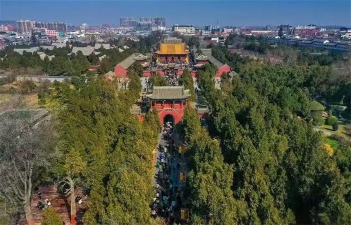 二、 千年营造,建筑薪火传承 太昊陵的营造史,是一部与华夏文明同频共振、历经沧桑而薪火不绝的建筑史诗。从春秋堆土为陵,到明清规制大成,三千年间,太昊陵屡毁屡建,越建越盛,每一次营造,都是文明的重生;每一次修缮,都是薪火的传承,最终成为中国帝王陵庙中陵庙合一宫殿式古建筑群的孤例,承载着中国古代建筑技艺、礼制文化、哲学思想的千年薪火。 据《左传·昭公十七年》记载:“陈,太皞之虚也。”春秋时期,宛丘已有伏羲陵墓,先民以土堆冢,焚香祭拜,开启了祭祀始祖的历史;汉代,朝廷立祠祭祀,陵庙初具规模,成为官方认可的祭祀场所;唐代,唐玄宗下诏增制,将伏羲纳入三皇祭祀体系,春秋两祭,陵庙建筑得以扩建;宋代,宋太祖赵匡胤钦定陈州为伏羲祭祀专地,置守陵户,禁樵采,祭祀规格升格为太牢之礼,陵庙建设步入正轨,成为皇家祭祀圣地。 靖康之变后,战火纷飞,太昊陵毁于兵燹,至元末荡然无存,只留断壁残垣,诉说岁月沧桑。明洪武元年,明太祖朱元璋兵败被追,逃入伏羲庙中,蜘蛛结网封门,元兵以为无人,得以脱险。朱元璋登基后,感念伏羲庇佑,下旨仿照南京明故宫规制重修太昊陵,遣开国功臣徐达督工,调集全国能工巧匠,历时数年,重建陵庙,奠定了太昊陵的皇家格局。明正统十三年、嘉靖年间,朝廷多次增修扩建,御碑亭、钟鼓楼、廊房等建筑相继落成,陵庙规模日益宏大;清代沿袭明制,康熙、乾隆、雍正等帝王多次遣官御祭,拨款修缮,对陵庙进行全面整修,完善建筑布局,增建附属设施。 历经明清两代五百余年的精心营造,太昊陵最终形成占地875亩、南北长750米的宏大格局,分外城、内城、紫禁城三道“皇城”,全陵有三殿、两楼、两廊、两坊、一台、一坛、一亭、一祠、一堂、一园、七观、十六门,十门相照,气势恢宏,成为中国古代建筑艺术的巅峰之作。 整座陵庙坐北面南,严格遵循先天八卦数理与皇家规制建造,以一条南北中轴线贯穿始终,从南至北,渡善桥、午朝门、道仪门、先天门、太极门、统天殿、显仁殿、太始门、八卦坛、伏羲陵冢依次排开。若将所有大门尽数打开,从南端渡善桥可一眼望见北端伏羲陵冢,视野通透,庄严肃穆,尽显皇家气派与始祖威仪,完美诠释了“天人合一”的哲学思想与“居中为尊”的礼制理念。 午朝门,太昊陵的正门,红墙黄瓦,重檐歇山,门额高悬“太昊陵”三个金字,笔力遒劲,气势磅礴。门前古槐参天,其中一株为明太祖朱元璋亲手栽植,历经六百余年风雨,树身半枯,却依旧虬枝苍劲,春来新芽勃发,成为陵庙千年营造的活见证,守护着太昊陵的建筑薪火。门钉按帝王规制排布,中门九排九路,两侧七排九路,彰显着始祖“百王之先”的至尊地位,每一颗门钉,都凝聚着古代工匠的匠心智慧。 穿过午朝门,沿神道前行,古柏夹道,肃穆清幽。道仪门、先天门依次排列,门名取自《易经》,蕴含着先天八卦的深邃哲理。先天门为砖石结构的拱门,高耸巍峨,寓意“先天而生,文明肇始”,门顶阁楼飞檐翘角,古朴典雅,尽显明代建筑的雄浑与清代建筑的精巧。 太极门为陵庙的中心门户,东西两侧分别为仰观门、俯察门,取自伏羲“仰观天文,俯察地理”之意。太极门广场东西南北四方共有八个通道,暗合八卦之数,处处彰显着易学文化的精髓。钟鼓楼分立两侧,晨钟暮鼓,响彻陵区,清晨撞钟开启祭祀之日,傍晚击鼓落幕一日烟火,成为陵庙千年不变的节律,传承着古代礼制建筑的文化薪火。 统天殿,太昊陵体量最大、等级最高的建筑,面阔五间,进深三间,通高15.7米,黄琉璃瓦覆顶,龙凤大脊凌空,南龙北凤,中间彩釉吉星陶楼,上书“天下一统”四字,左右配以二十八星宿,象征天上星宿守护人祖。殿内供奉着太昊伏羲氏圣像,圣像身披树叶,腰裹兽皮,目光慈善,手捧先天八卦,端坐于须弥座上,威严而慈祥。四壁彩绘着伏羲创世的不朽功绩:画八卦、结网罟、定姓氏、制嫁娶、兴庖厨、造甲历,一幅幅壁画,如同一部可视化的远古史诗,诉说着始祖的盖世奇功。“统天”二字取自《易经》“大哉乾元,万物资始,乃统天”,唯有伏羲始祖,配得上此等至尊名号,这座大殿,是太昊陵建筑薪火的核心载体。 统天殿之后,是显仁殿,寓意“显始祖仁德”,面阔七间,进深五间,规模仅次于统天殿,殿内供奉着伏羲与女娲圣像,见证着华夏民族繁衍生殖的古老信仰。殿内青石上有一圆孔,名为“子孙窑”,是伏羲制嫁娶、订婚姻的象征,千百年来,无数善男信女触摸石孔,祈求姻缘美满、子孙绵延,延续着远古的浪漫与祈愿,成为建筑与民俗融合的生动见证。 再往北,太始门高耸,砖石结构,重檐殿宇,下为拱门,上为阁楼,寓意“太初之始,文明肇兴”,与明清帝陵的“方城明楼”形制吻合,是太昊陵皇家规制的重要体现。门内立有明太祖朱元璋御祭碑,碑文记载着朱元璋感恩伏羲庇佑、夺得天下的史实,字迹苍劲,文风古朴,是太昊陵皇家祭祀与建筑营造的直接见证。 穿过太始门,眼前便是占地十余亩的八卦坛,以青石铺就,按先天八卦方位排列,坛心为阴阳鱼图案,站在坛心,仿佛能感受到天地阴阳交汇的灵气,体悟伏羲画卦的玄妙。八卦坛北端,便是伏羲陵冢,陵高20余米,周长200米,上圆下方,取“天圆地方”之意,陵上古柏苍劲,芳草萋萋,被誉为“羲陵岳峙”,为淮阳八景之首。 陵前立一巨碑,上书“太昊伏羲氏之陵”,此碑便是流传千古的汗巾碑。相传宋神宗年间,陵庙重修,欲