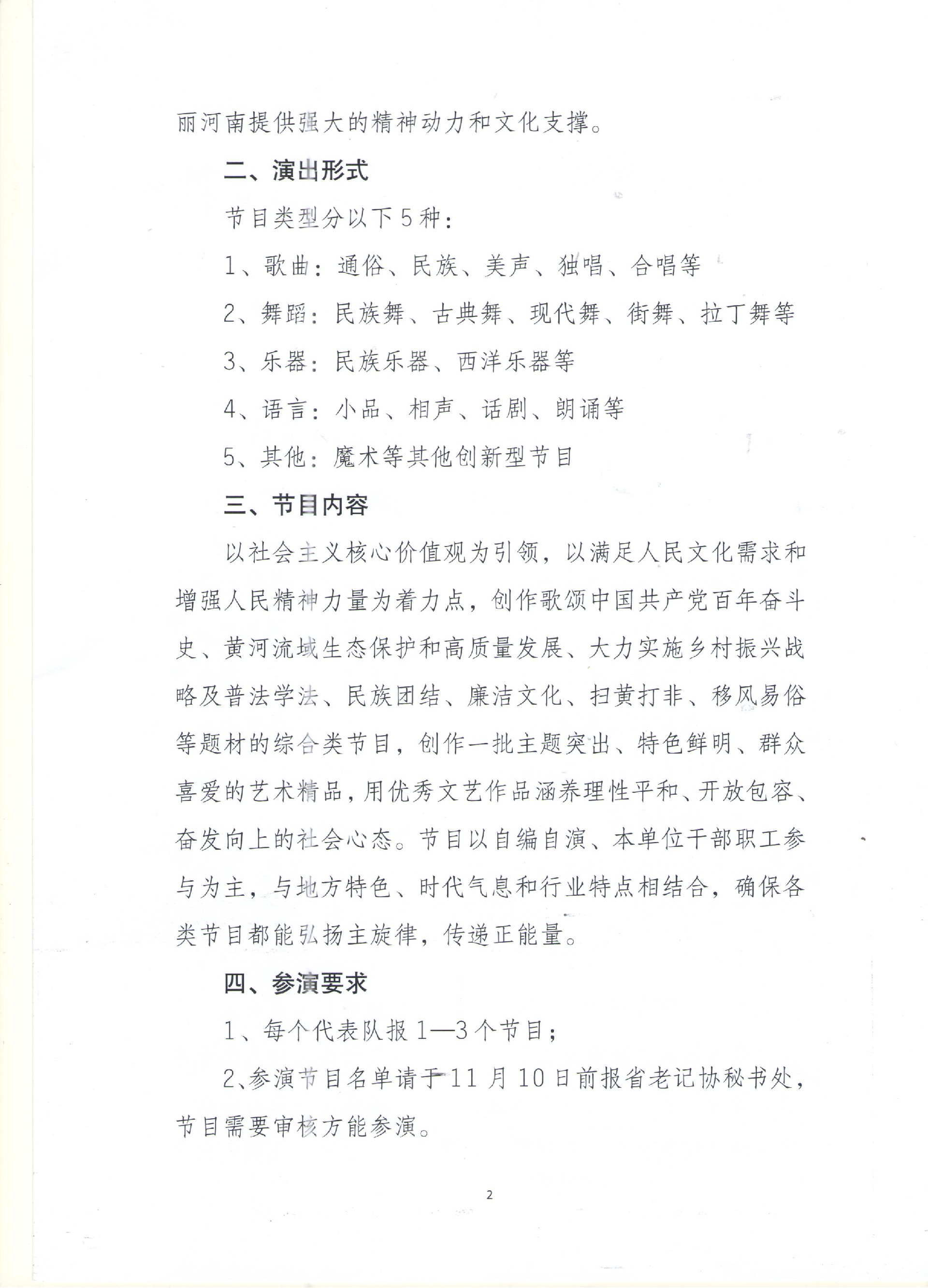 关于举办“礼赞新时代 奋进新征程”文艺汇报演出活动的通知 为深入学习贯彻党的二十大精神,进一步丰富离退休老记者、老编辑的精神文化生活,不断满足基层群众日益增长的美好生活需要,展示我省老新闻工作者老有所学、老有所为、老有所乐新的精神风貌,省老记协拟于12月中下旬举办迎新年文艺演出活动,现就有关事宜通知如下: 一、指导思想 以习近平新时代中国特色社会主义思想为指导,深入学习宣传贯彻党的二十大和习近平总书记视察河南重要讲话指示批示精神,全面贯彻落实河南省第十一次党代会精神,以弘扬伟大建党精神,满足人民群众日益增长的美好生活需求为根本目的,展现全省经济社会发展良好态势和人民干事创业精神风貌,广泛开展聚焦新时代、传递正能量的群众文化活动,提高社会文明程度,为奋力谱写社会主义现代化美丽河南提供强大的精神动力和文化支撑。 二、演出形式 节目类型分以下5种: 1、歌曲:通俗、民族、美声、独唱、合唱等 2、舞蹈:民族舞、古典舞、现代舞、街舞、拉丁舞等 3、乐器:民族乐器、西洋乐器等 4、语言:小品、相声、话剧、朗诵等 5、其他:魔术等其他创新型节目 三、节目内容 以社会主义核心价值观为引领,以满足人民文化需求和增强人民精神力量为着力点,创作歌颂中国共产党百年奋斗史、黄河流域生态保护和高质量发展、大力实施乡村振兴战略及普法学法、民族团结、廉洁文化、扫黄打非、移风易俗等题材的综合类节目,创作一批主题突出、特色鲜明、群众喜爱的艺术精品,用优秀文艺作品涵养理性平和、开放包容、奋发向上的社会心态。节目以自编自演、本单位干部职工参与为主,与地方特色、时代气息和行业特点相结合,确保各类节目都能弘扬主旋律,传递正能量。 四、参演要求 1、每个代表队报1—3个节目; 2、参演节目名单请于11月10日前报省老记协秘书处,节目需要审核方能参演。 五、工作要求 为确保活动顺利进行,各新闻单位老干部处(室)要高度重视、精心组织、广泛动员、积极参与、隆重热烈、自娱自乐,要指定专人负责,成立演出活动领导小组,抓好活动的组织实施,做好节目内容审查。并提前10天提供已定稿的节目单、音乐、视频影像等资料。 六、奖项设置 1、表演节目设金奖,银奖若干,由省老记协名义颁发奖品。 2、演出单位设优秀组织奖若干,以省老记协名义颁发奖品。 共计15个节目,演出时间在1:30分钟左右。 七、组织领导 文艺汇报演出由省老记协、河南日报报业集团、河南广播电视台、郑州报业、新华社河南分社联合主办。 联系人:王燕 13803716227 65889346